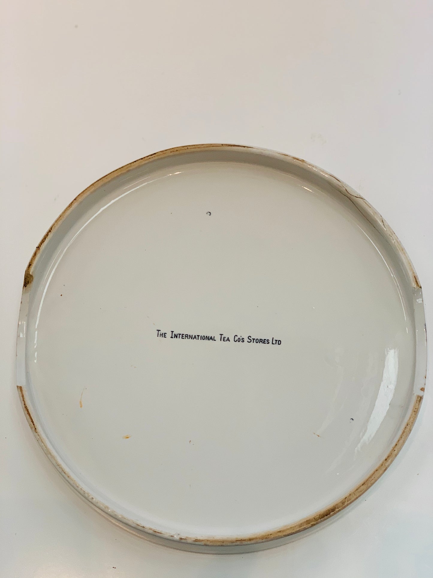 A round white ironstone pottery grocers slab. Early 20th Century, with stylized black transfer printed 'Pure Butter' lettering around the front edge. The underside of the slab has the black makers transfer for Parnall & Sons